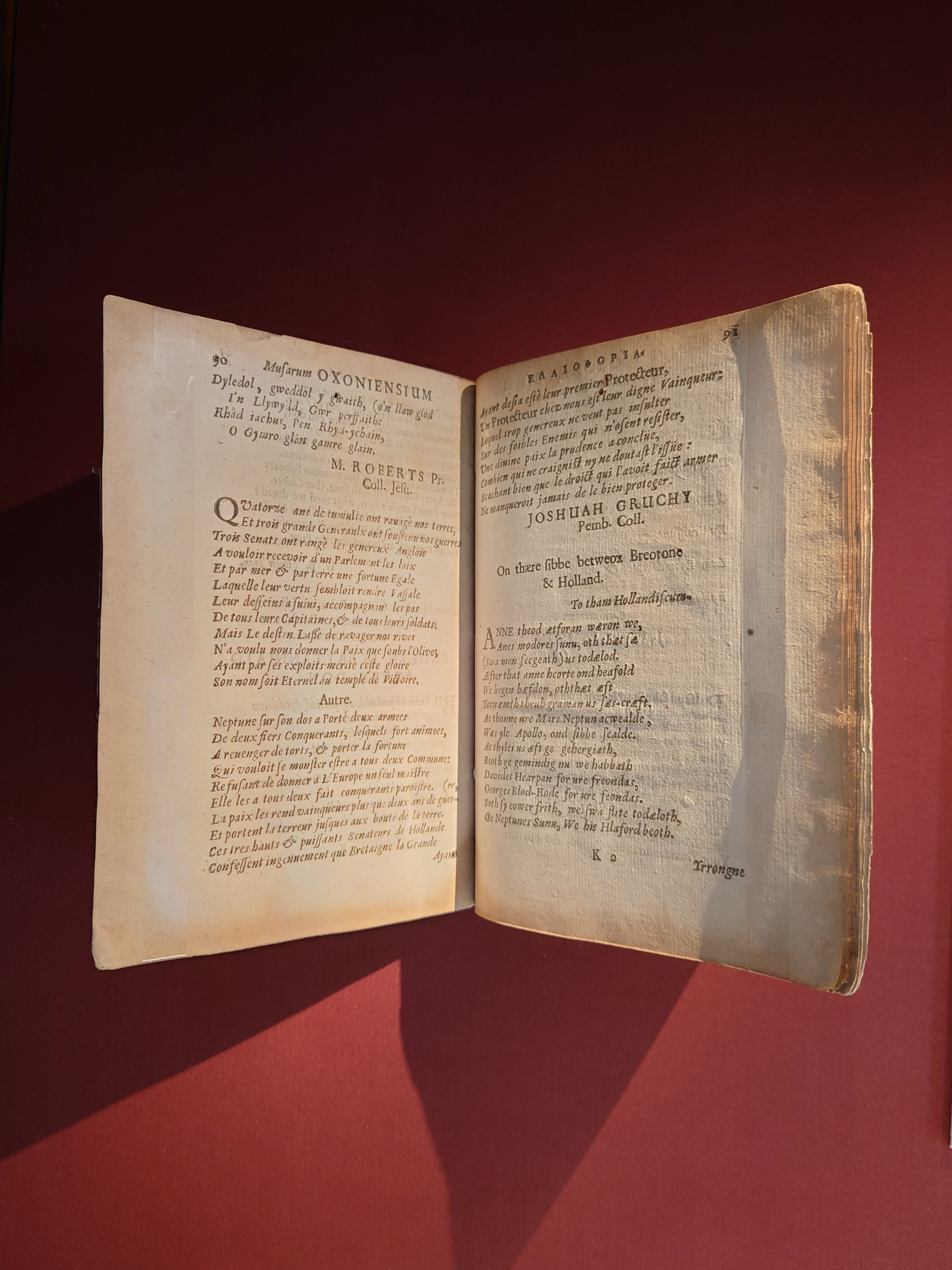 Musarum Oxoniensium ἐλαιοφορία, shown open on a double page of printed text.